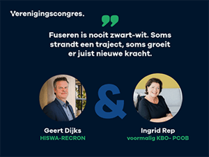 Wat zijn de belangrijkste voorwaarden voor een geslaagde fusie? Ingrid Rep was betrokken bij het niet gelukte fusieproces van KBO en PCOB, twee seniorenverenigingen, en Geert Dijks vierde als directeur van HISWA-RECRON onlangs het eerste lustrum van dit succesvolle fusiekoppel. Wat werkt en wat niet?