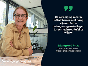 Margreet Plug is directeur-bestuurder van brancheorganisatie Goede Doelen Nederland. Net als elke vereniging heeft zij wel eens te maken met belangentegenstellingen tussen leden. Hoe kun je die met elkaar verbinden? Ze deelt graag haar ervaringen met andere verenigingen tijdens haar kennissessie op het Verenigingscongres.