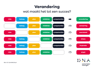 Verandering binnen verenigingen vraagt om meer dan goede bedoelingen. Wetenschappelijk onderzoek wijst uit dat duurzame verandering ontstaat wanneer zes essentiële elementen op elkaar zijn afgestemd: visie, draagvlak (belang), plan, middelen, competenties en structurele ondersteuning.